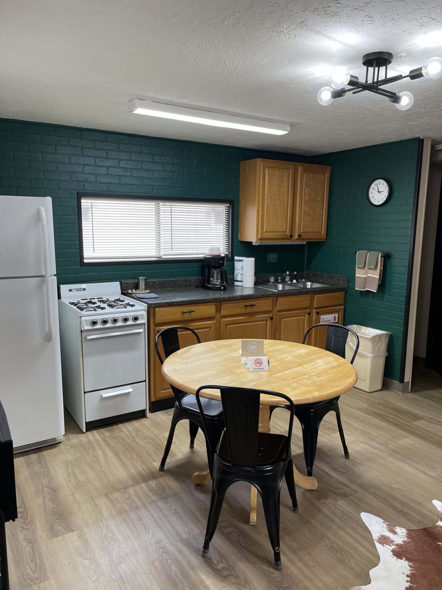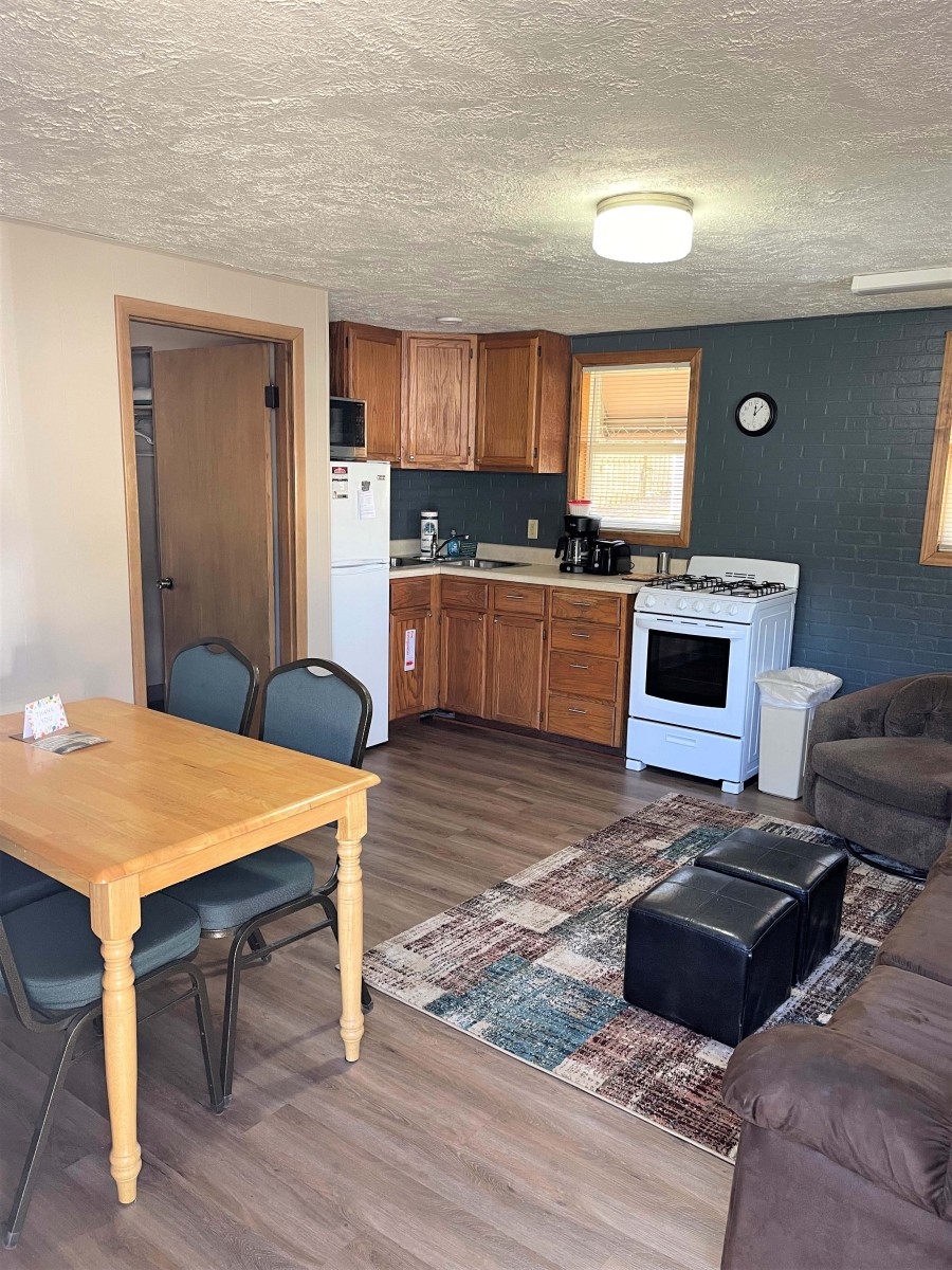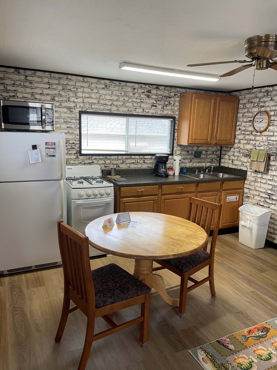 Plates, Pots/Pans, Silverware, and appliances. (When you rent both cabins you will have 2 kitchens, 2 dining tables, and two living areas.)