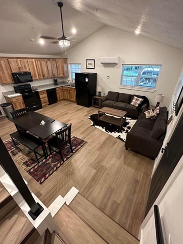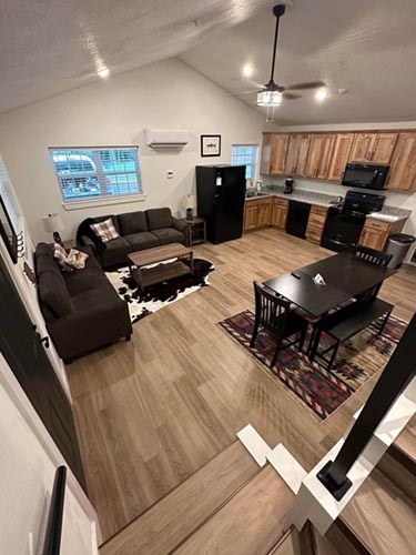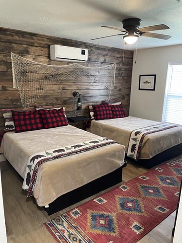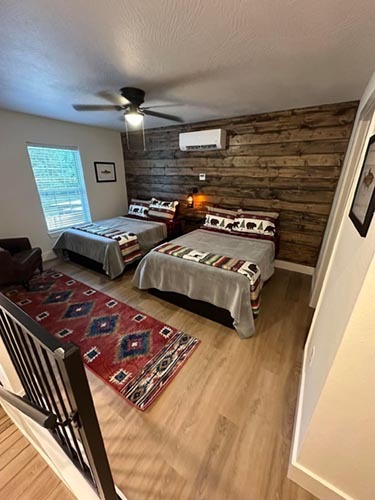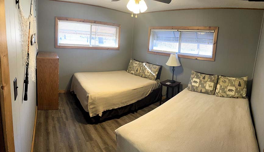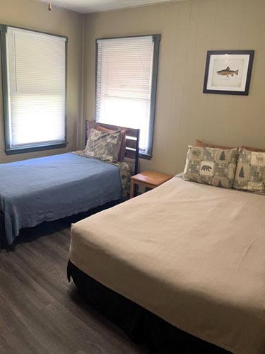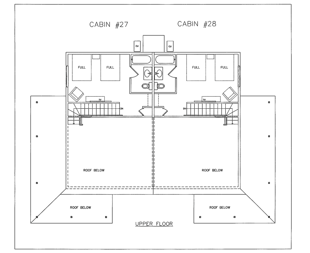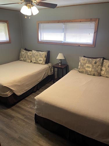 2 Bed, 2 Bath (Cabin 27: 1 King downstairs, 2 Full Upstairs, Cabin 28: 2 Full Downstairs, 2 Full Upstairs)