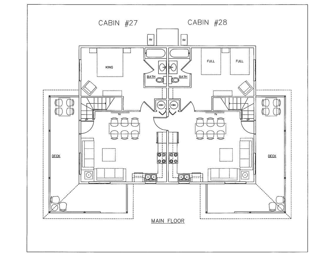 Cabins 27 & 28 are a duplex. They can be rented together for $439.00 nightly plus tax. Please contact our office for more information.